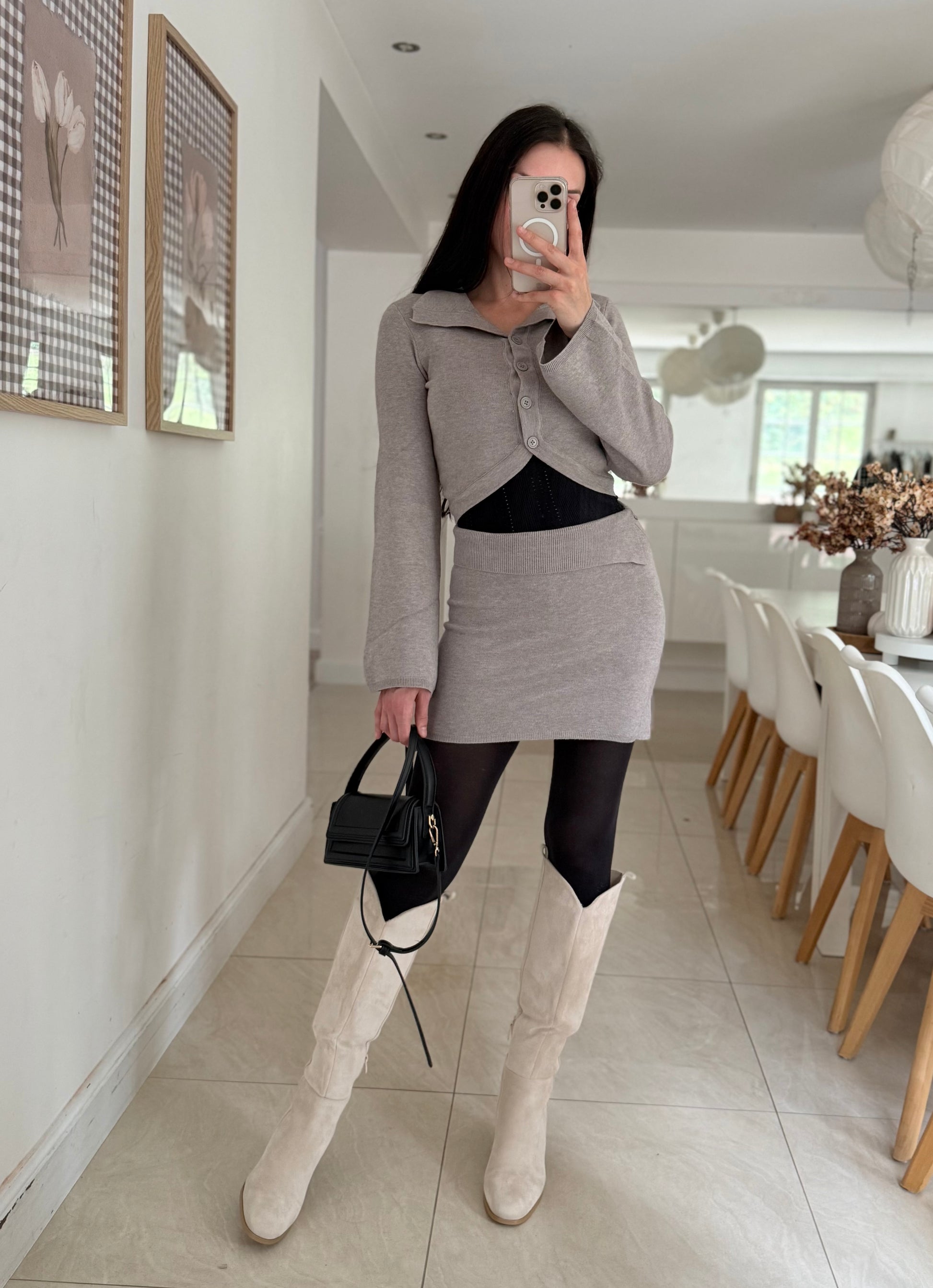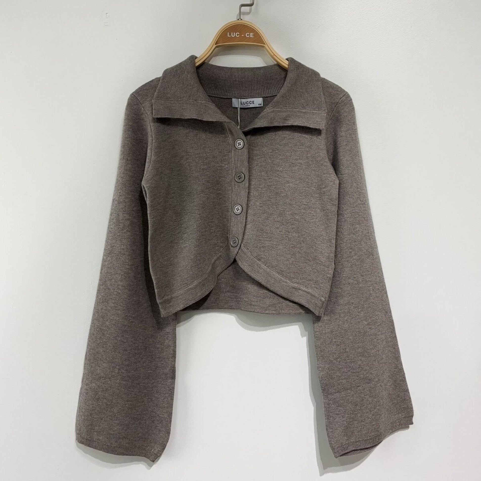 Cardigan court, avec col à revers et manches évasées. Qualité premium. Jupe assortie disponible. Couleur taupe.
