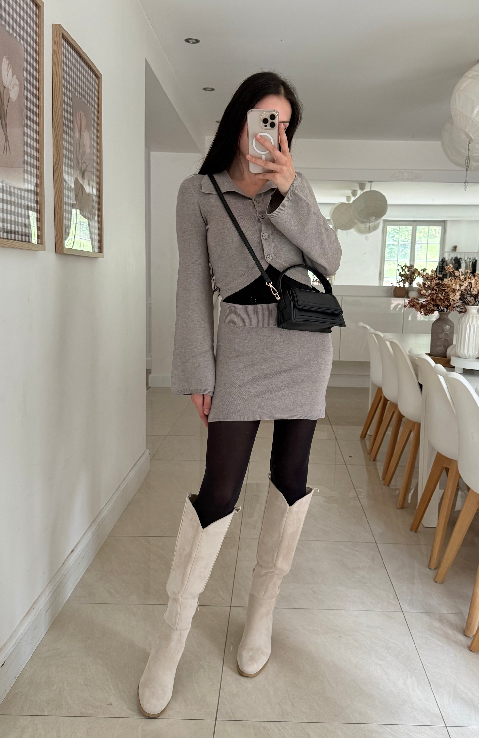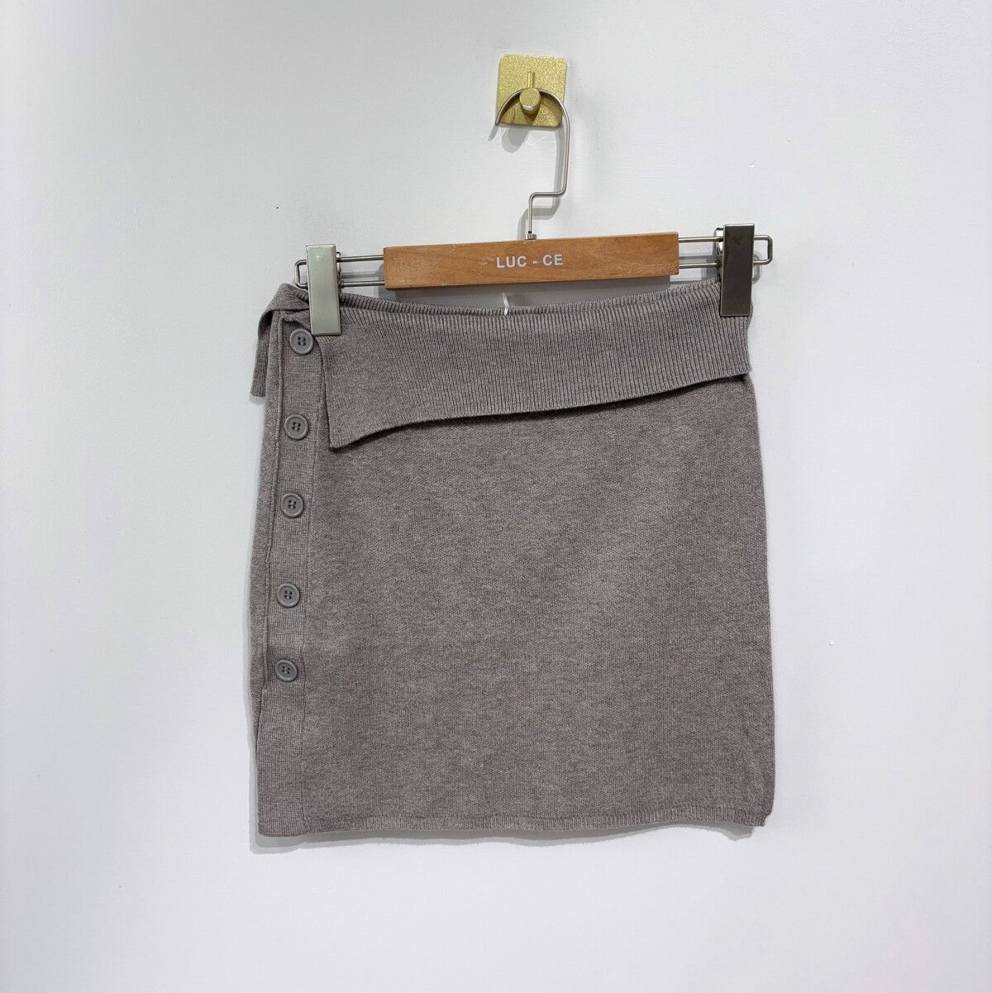 Jupe courte en maille avec revers et boutons. Qualité premium. Gilet assorti disponible. Couleur taupe