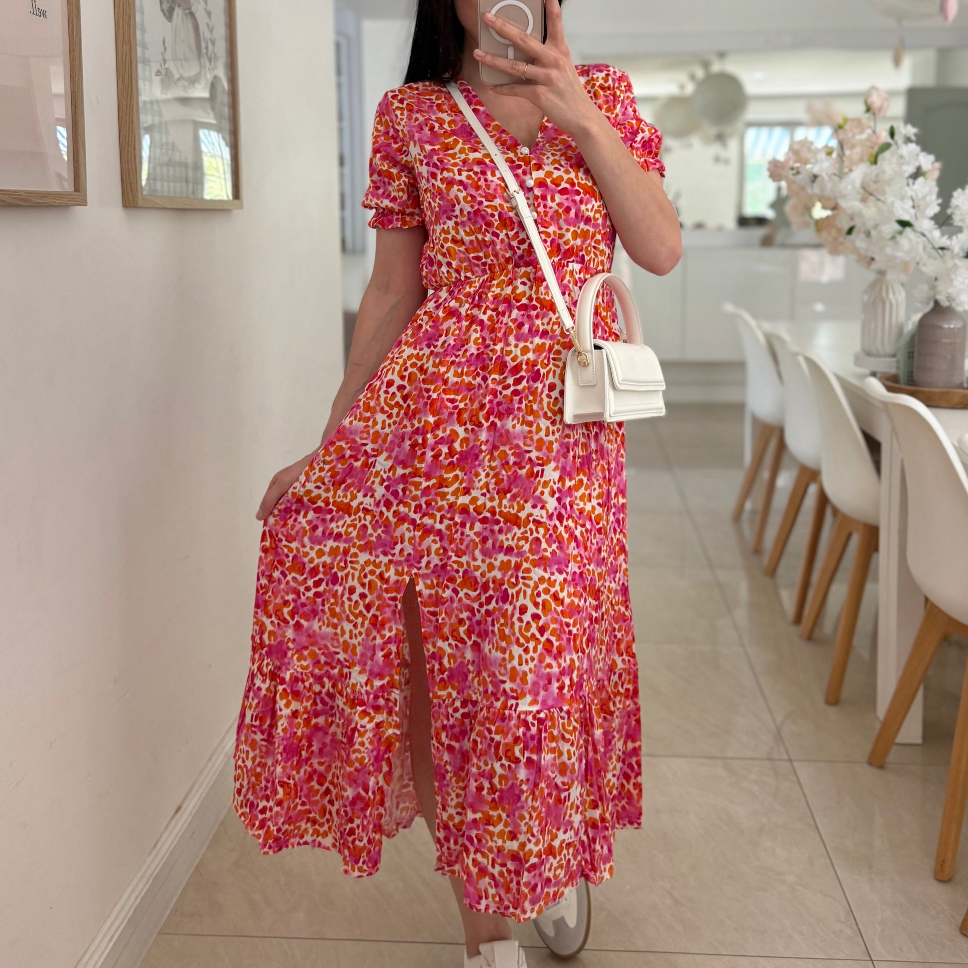 Robe longue imprimée fluide fendue, élastiquée aux manches et sous la poitrine. Boutons à la poitrine.