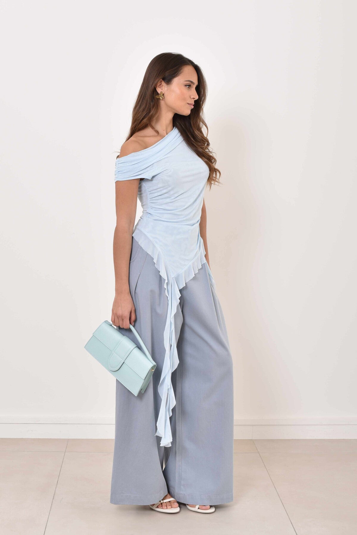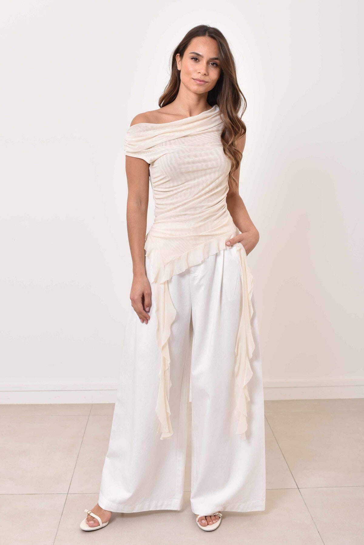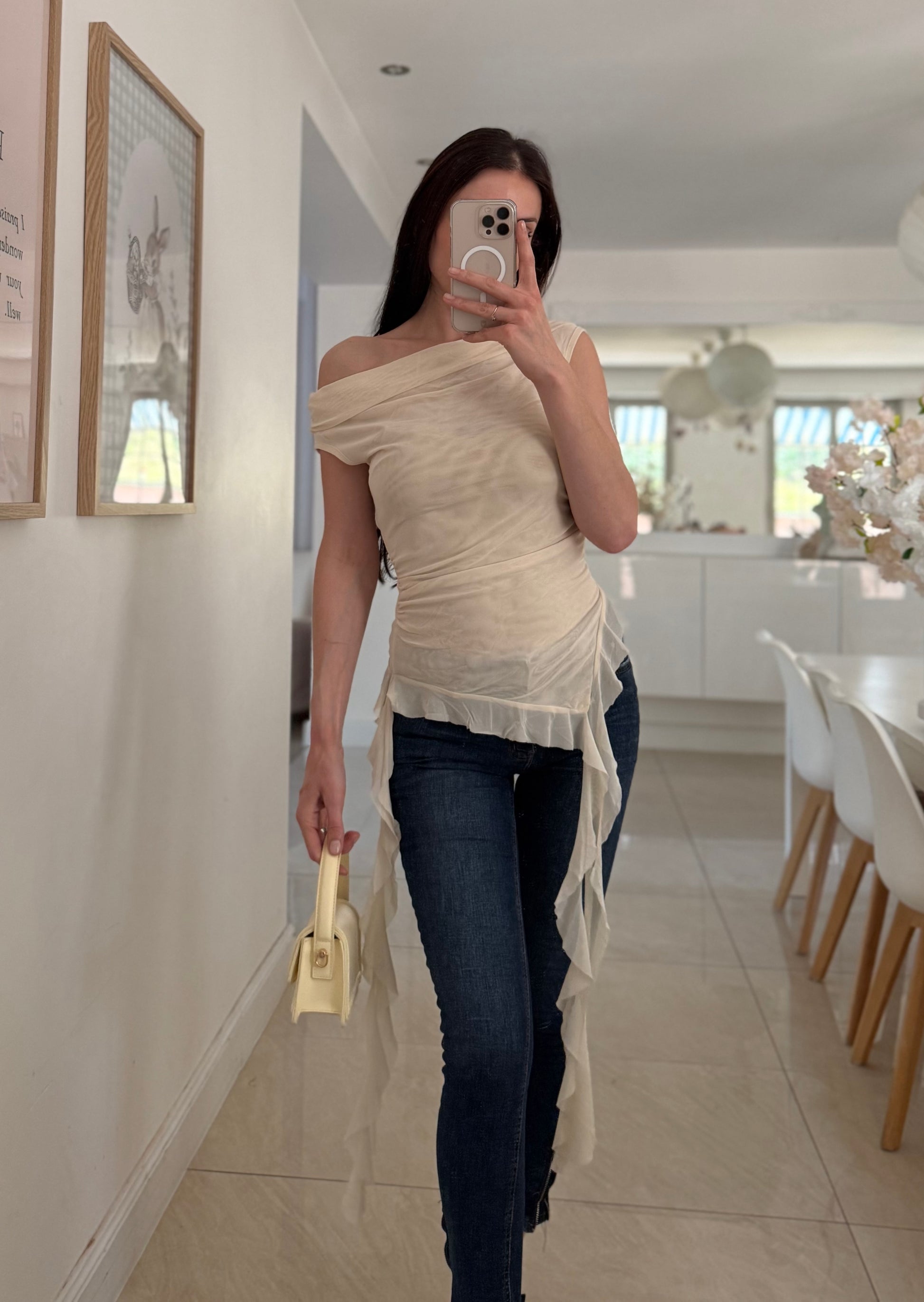 Top à épaule dénudée à volants. Le top est transparent et se porte de préférence avec un sous vêtement couleur nude.