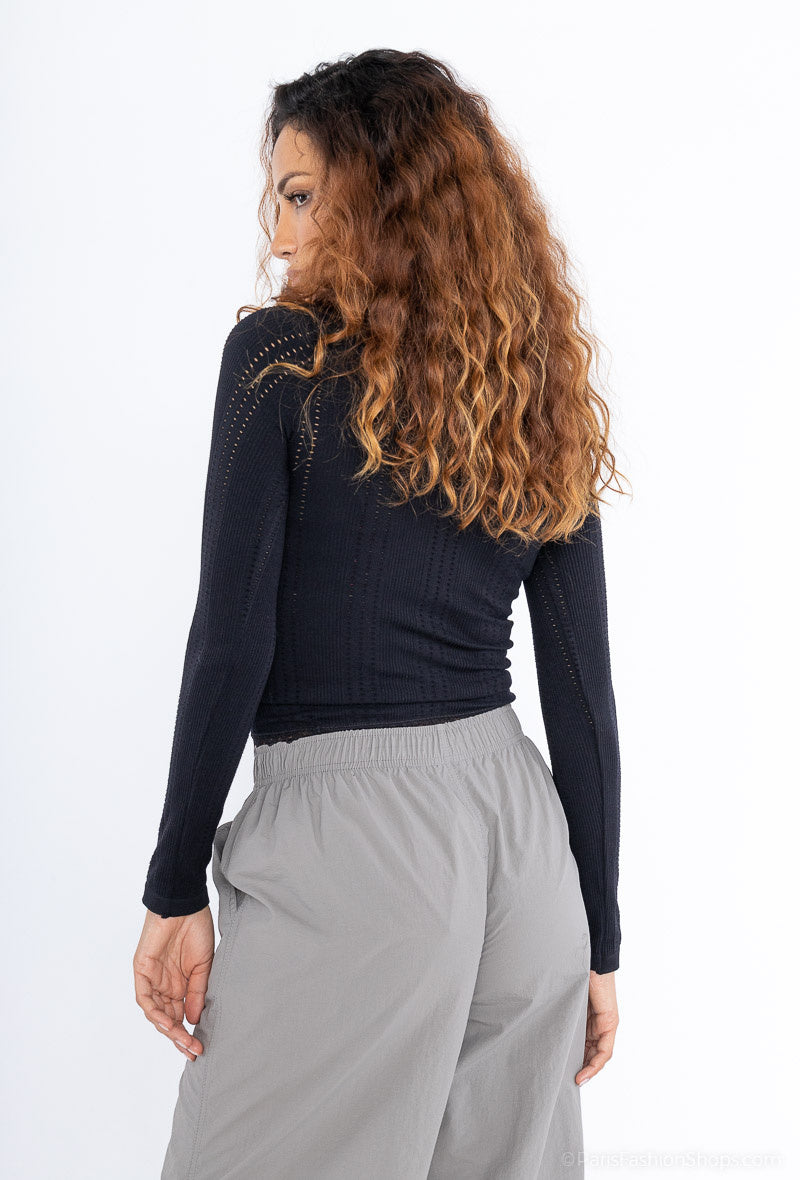 Coup de coeur pour ce top légèrement ajouré, extra doux et qui met en valeur la silhouette. Idéal à porter avec un bas taille haute. Couleur: noir